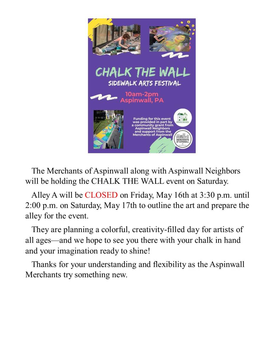 The Merchants of Aspinwall along with Aspinwall Neighbors will be holding the CHALK THE WALL event on Saturday.