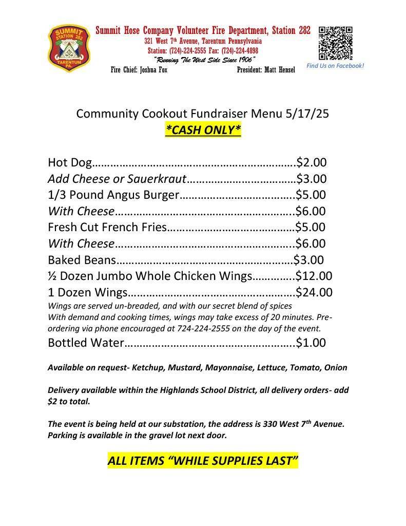 Join us for a fun-filled day at Summit Hose's Community Cookout on May 17, 2025, from 12:00 PM to 6:00 PM at the Summit Hose Fire Department, located at 321 West 7th Avenue. Enjoy great food and great company while supporting the fire department!
