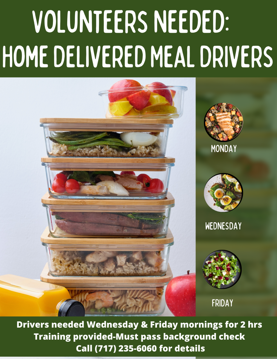 South Central Senior Center is in need of volunteers for their meal on wheels program. Drivers are currently needed Wednesday and Friday mornings for two hours. Training is provided. Call 717-235-6060 for more information.