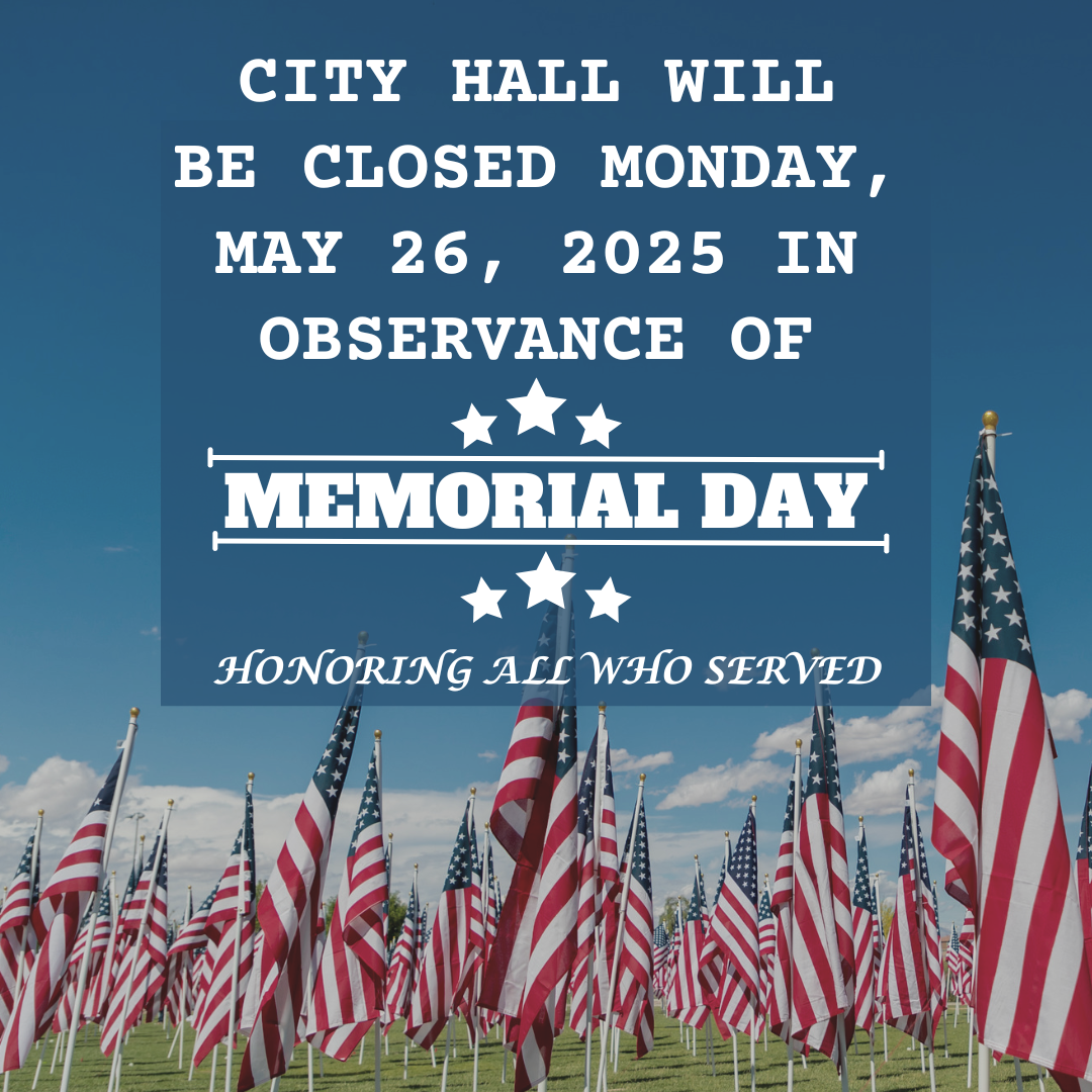 City Hall will be closed on Monday, May 26, 2025, in observance of Memorial Day. As a community, we come together to honor and remember those who gave their all in service to our nation.