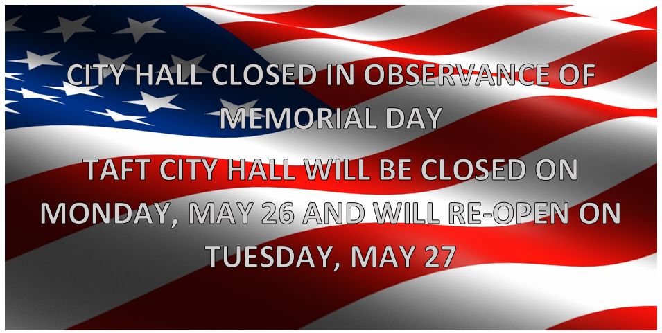 The City of Taft-City Hall will be closed on Monday, May 26th, 2025 in observance of Memorial Day.