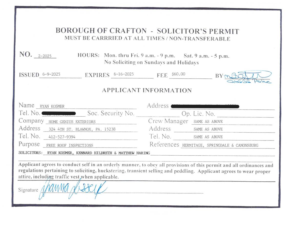 Anyone soliciting within the Borough of Crafton must have a solicitation permit to do so. Please contact the Crafton Police Department with concerns or questions regarding solicitation permits.