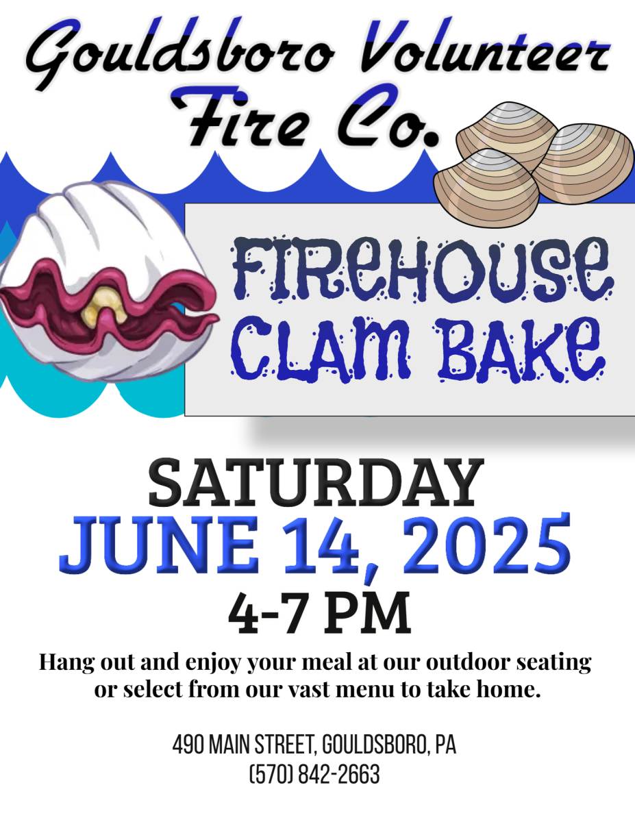 Gouldsboro Volunteer Fire Company is hosting a Firehouse Clam Bake this Saturday, June 14, 2025 from 4-7pm. Please see the attached flyer for more information.