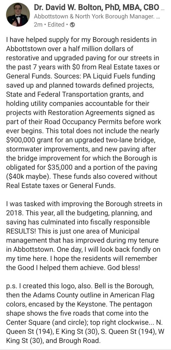 Most of the streets on the West side of the borough have been paved to date, with more work ahead. Plans are being coordinated with the utility companies for the East side in 2026. I have supplied a summary below of my work over the past 7 years. Thank you for the opportunity to serve you. Together, we have Made Abbottstown Great Again.