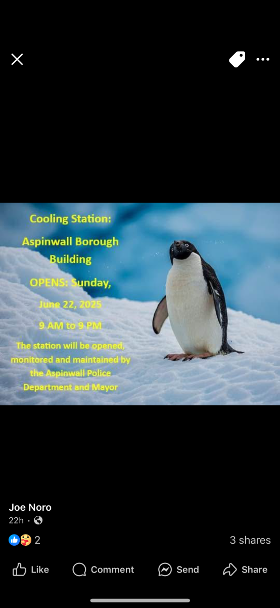 The Borough building will serve as a cooling station starting on Sunday, June 22nd from 9 am to 9 pm. The station will be managed and maintained by Mayor Noro and the Aspinwall Police Department.