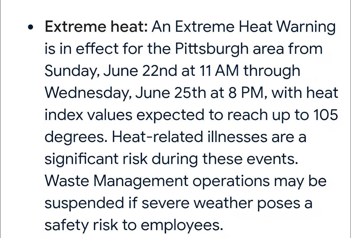 Please be advised: Waste Management services may be suspended due to the extreme heat forecast through Wednesday evening.