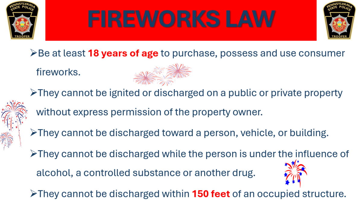 Attached is a reminder from the Pennsylvania State Police concerning the purchase, possession and use of consumer fireworks.