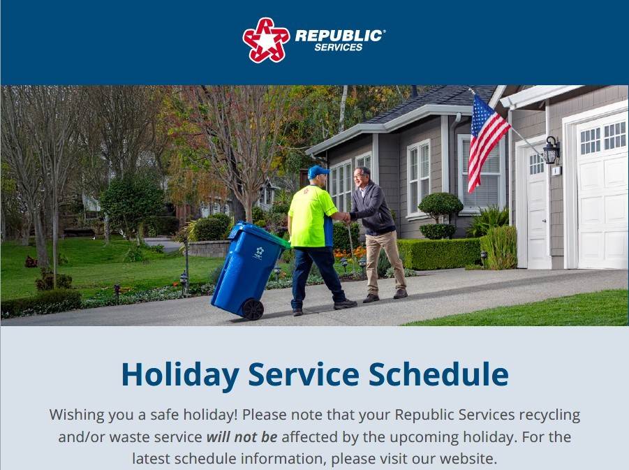 Please note that your Republic Services recycling and/or waste service will not be affected by the upcoming holiday. For the latest schedule information, please visit our website.