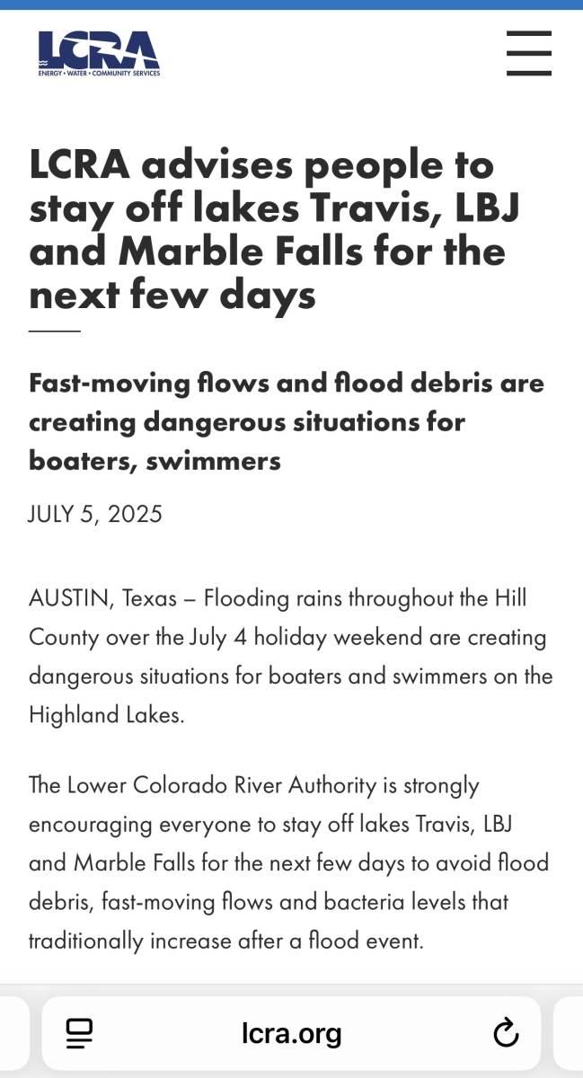 Read more here: https://www.lcra.org/news/news-releases/lcra-advises-people-to-stay-off-lakes-travis-lbj-and-marble-falls-for-the-next-few-days/