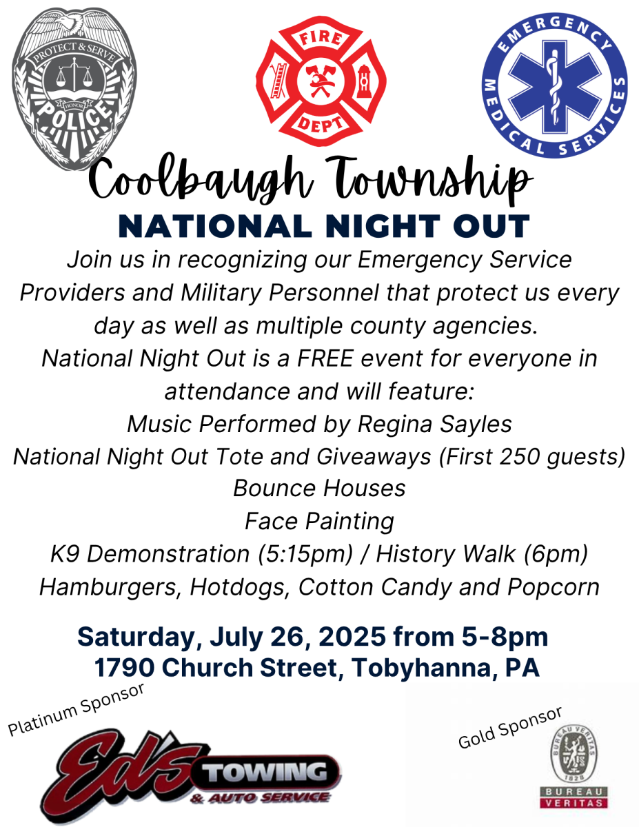 Coolbaugh Township will be hosting their First Annual National Night Out Event on Saturday, July 26. 2025 from 5-8pm at the Coolbaugh Township Municipal Park. Event is Free and Open to the Public. National Night Out will feature and honor our Emergency Service Providers, Military Personnel, County Agencies and Township Committees. There will be fun for all ages, so come out for some free food, Giveaways, fun in the bounce houses, face painting and Dancing to Music Performed by Regina Sayles. K9 demonstration by the Pocono Mountain Regional Police will be held at 5:15pm. and a historical walk of the park will be held at 6pm. The first 250 people through the gates will get a tote bag including National Night Out Goodies, so mark your calendars and don't be late. A special thanks to all of our 2025 Sponsors.