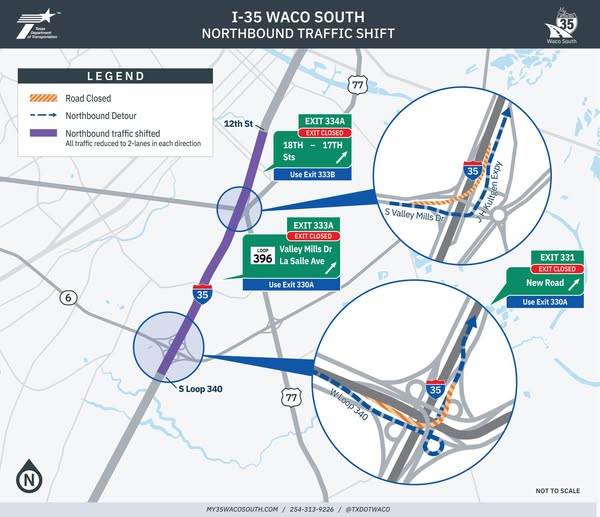 I-35 WACO SOUTH | The Texas Department of Transportation (TxDOT) will begin shifting all northbound traffic to the southbound side of I-35 from 12th Street to S Loop 340 as part of the My35 Waco South Construction Project on Saturday, July 12, 2025, at 7 p.m. Various lane and ramp closures within the project limits will occur during this time. The shift is expected to be complete and roadways reopened by 10 a.m. on Sunday, July 13.