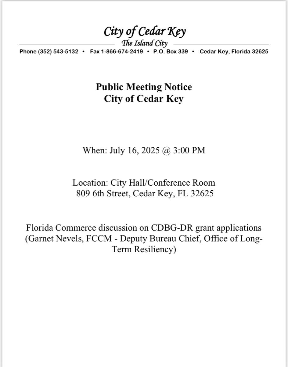 This notification was posted by City of Cedar Key. City of Cedar Key is solely responsible for this notification and unless specifically indicated, no other community or individual utilizing Savvy Citizen is sponsoring, responsible for, or endorsing this notification.