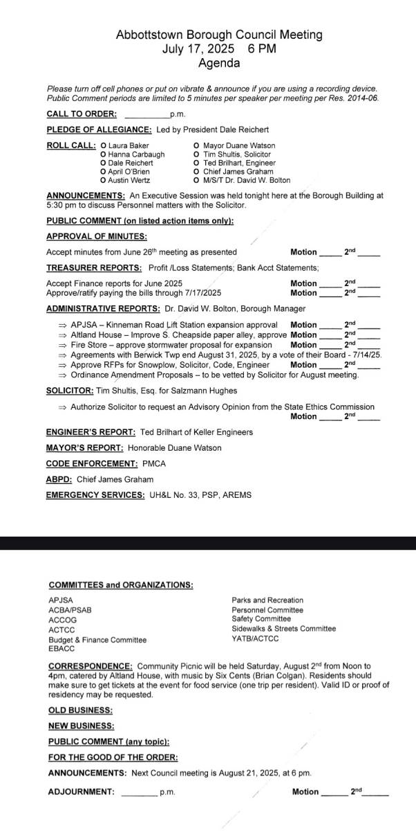 This notification was posted by Borough of Abbottstown. Borough of Abbottstown is solely responsible for this notification and unless specifically indicated, no other community or individual utilizing Savvy Citizen is sponsoring, responsible for, or endorsing this notification.