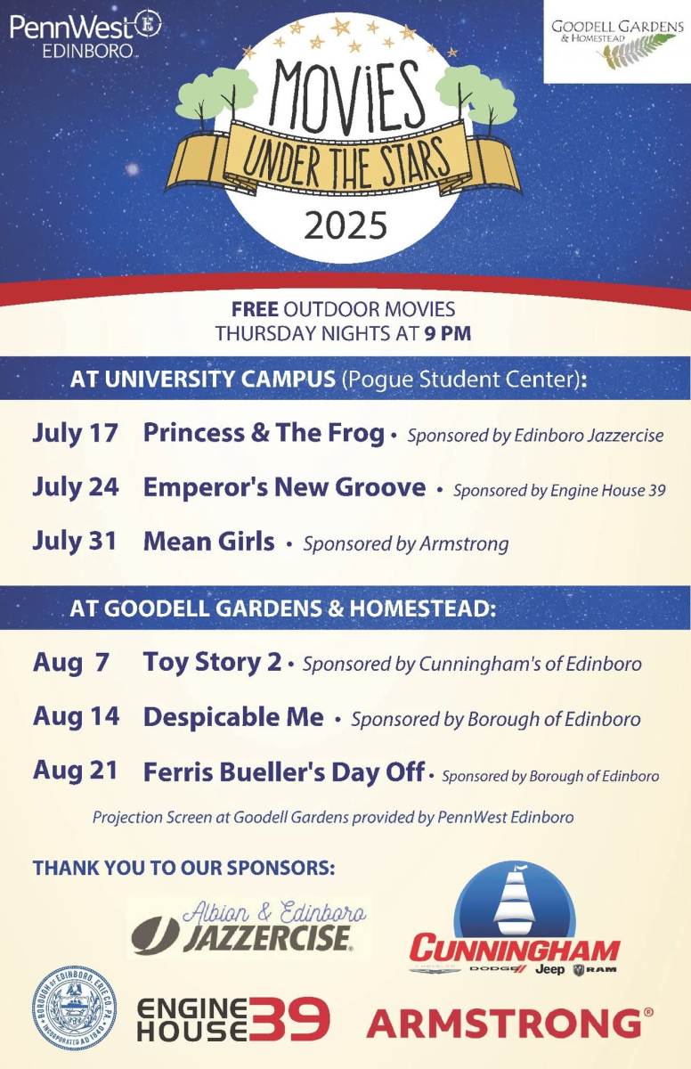 Each Thursday night from July 17 to August 21, PennWest Edinboro and Goodell Gardens will host “Movies Under the Stars,” beginning at dark (about 9 PM, may be earlier). Admission and parking are FREE! Just bring a chair or blanket and enjoy a summer night under the stars.