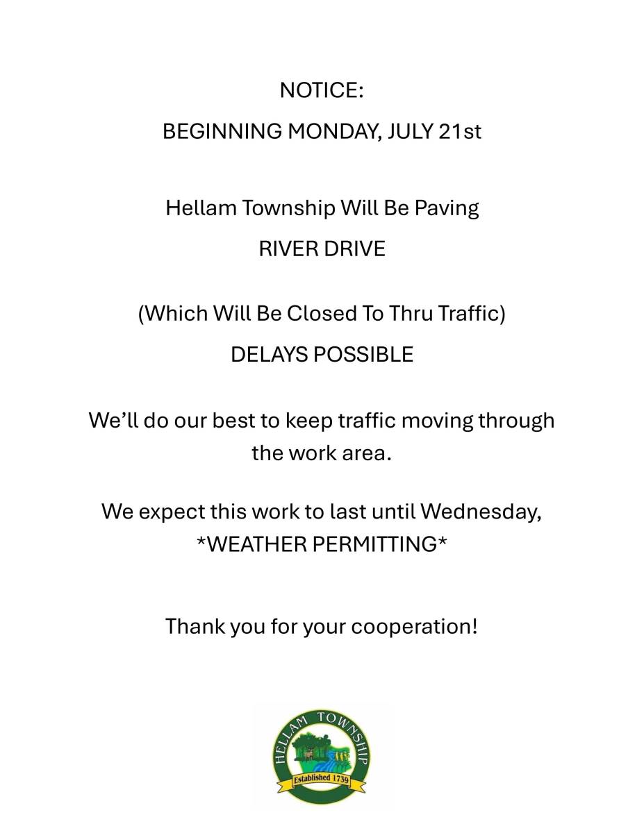 This notification was posted by Hellam Township. Hellam Township is solely responsible for this notification and unless specifically indicated, no other community or individual utilizing Savvy Citizen is sponsoring, responsible for, or endorsing this notification.