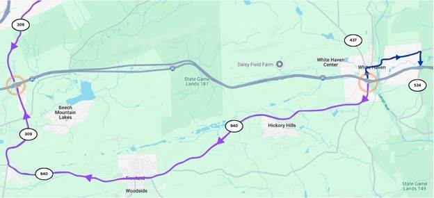 During the extended closure, passenger vehicles seeking to access I-80 east will continue to follow the posted detour route via Church Street (PA 940), Berwick Street/River Street/State Street (PA 940), and PA 534 to Exit 274. Truck traffic from the Wilkes-Barre region will remain detoured via PA 309 to Exit 262. Trucks traveling from White Haven should continue to use PA 940 and PA 309 to reach Exit 262.