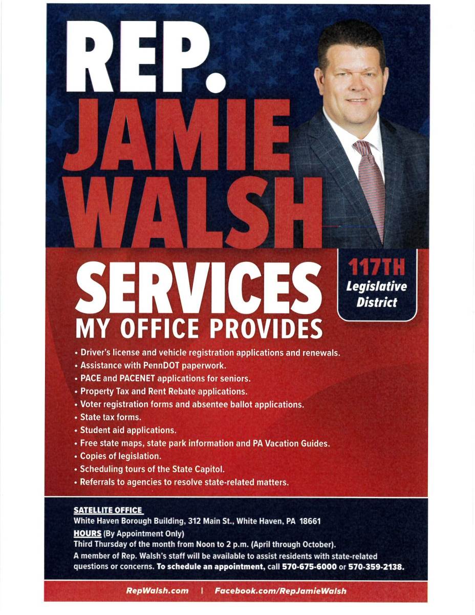 A member of Rep. Walsh's staff will be available to assist residents with state-related questions or concerns. (Third Thursday of the month April through October)