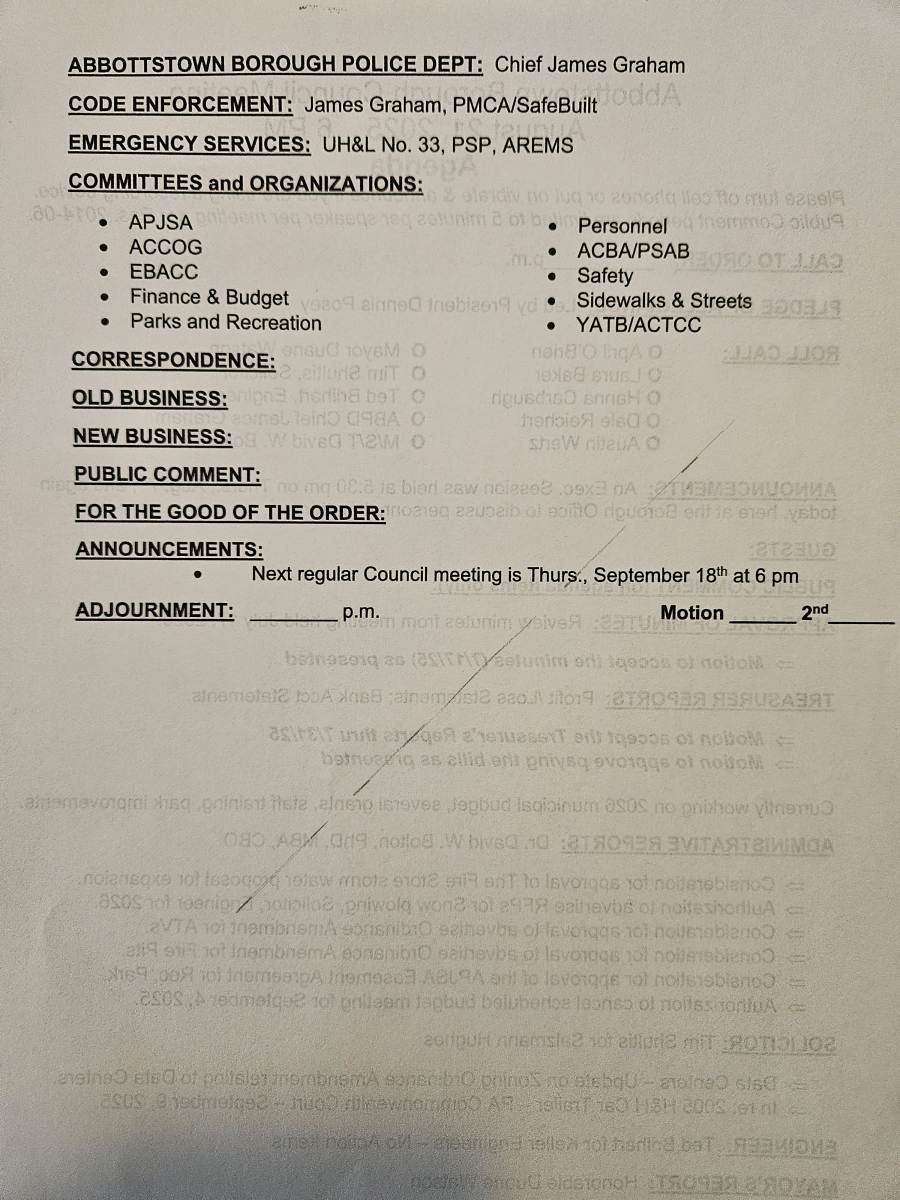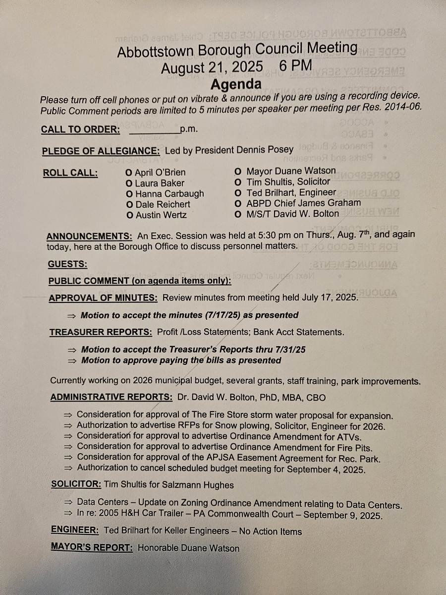 This notification was posted by Borough of Abbottstown. Borough of Abbottstown is solely responsible for this notification and unless specifically indicated, no other community or individual utilizing Savvy Citizen is sponsoring, responsible for, or endorsing this notification.