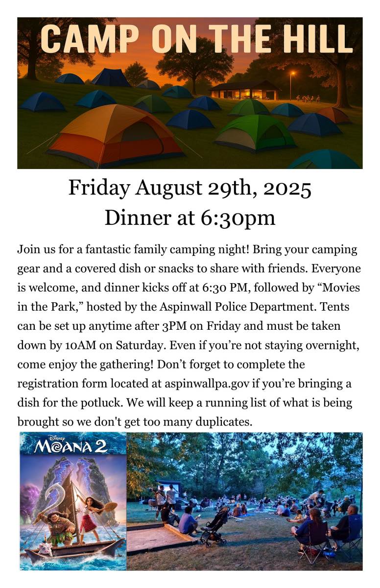Join us for a fantastic family camping night! Bring your camping gear and a covered dish or snacks to share with friends. Everyone is welcome, and dinner kicks off at 6:30 PM, followed by “Movies in the Park,” hosted by the Aspinwall Police Department. Tents can be set up anytime after 3PM on Friday and must be taken down by 10AM on Saturday. Even if you’re not staying overnight, come enjoy the gathering! Don’t forget to complete the registration form located at www.aspinwallpa.gov/camp-on-the-hill-page if you’re bringing a dish for the potluck. We will keep a running list of what is being brought so we don't get too many duplicates.