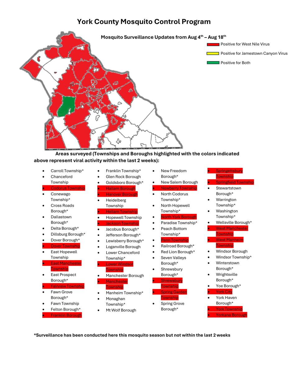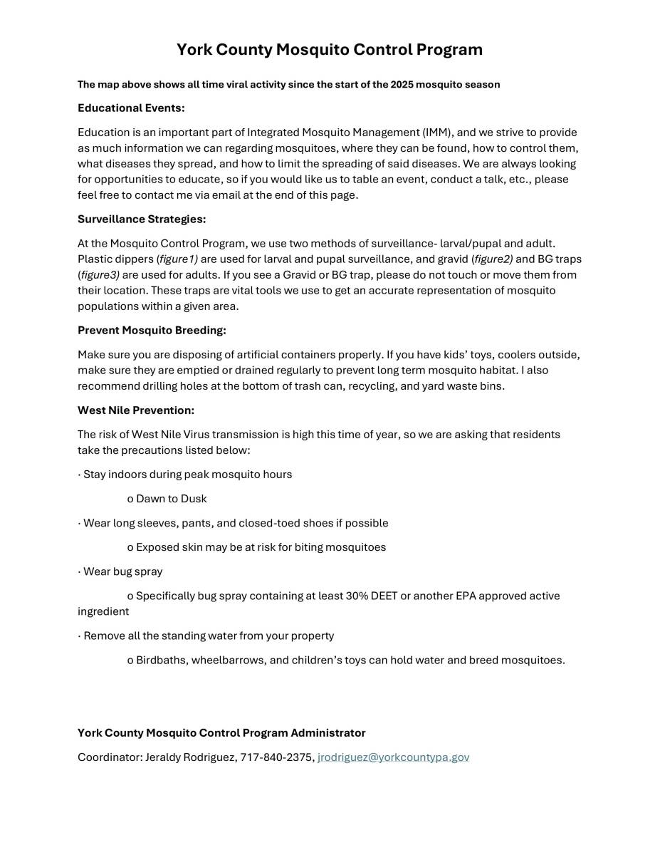 I’m sending this email to inform you of what has been going on regarding the mosquito program for the 2025 season. Attached to this email is a document that contains brief information regarding West Nile Virus and Jamestown Canyon Virus activity in York County. There is a map that indicates all-time viral activity in 2025. Any townships and boroughs listed below that are highlighted have tested positive for West Nile Virus, Jamestown Canyon Virus, or both in the last two weeks. The second page talks about, what we do as a program to survey the county for mosquitoes, mosquito/virus prevention information, and educational events that we will be a part of. The third and final page has my contact information as well as visual examples of the traps and dippers we use out on the field. If you have any questions, please feel free to reach out to me.