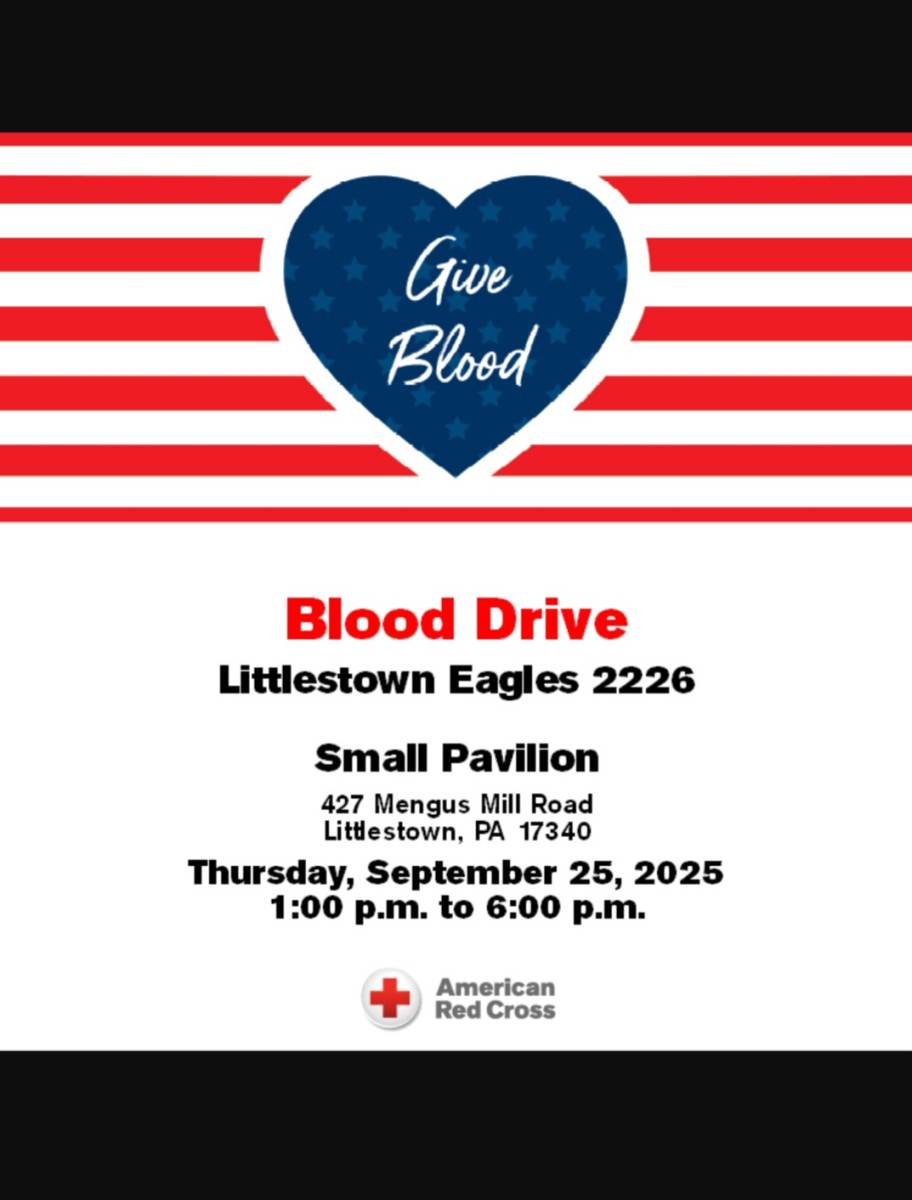 The Littlestown Eagles 2226 will hold a blood drive on Thursday, September 25, 2025 from 1pm to 6pm in the small pavilion located at 427 Mengus Mill Road.