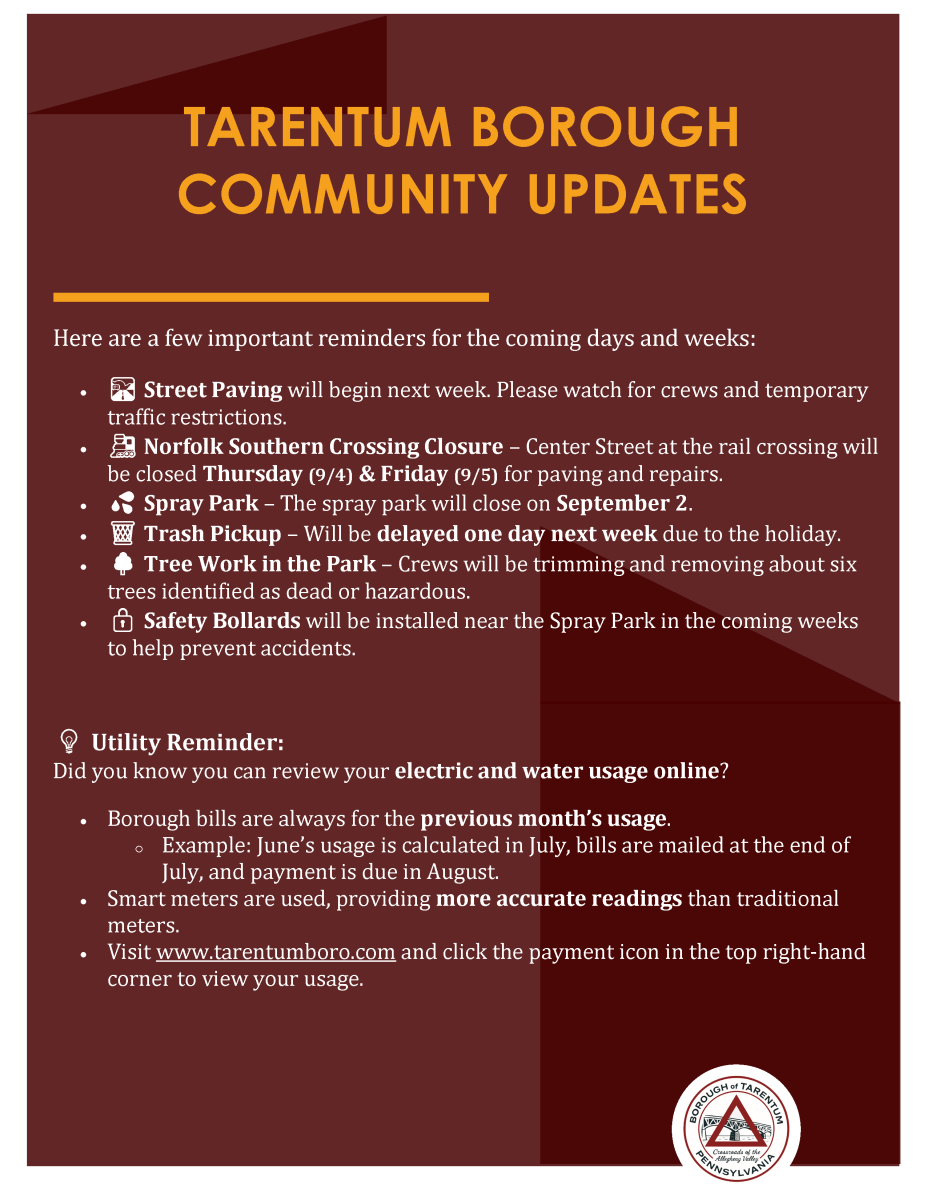 Check out the attached flyers, and thank you for your continued patience as we work to keep Tarentum safe, welcoming, and moving forward.