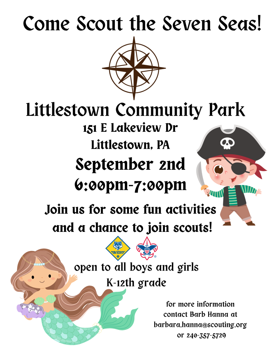 Fun, free event on Tuesday Sept 2 from 6-7pm at Littlestown Community Park open to all boys and girls from kindergarten-age 17! Scout the Seven Seas will feature pirate and mermaid-themed activities to introduce your child to Scouting in a fun way! Families with youth interested in joining Cub Scouts or Scouts BSA can also register at the event to join one of the 5 BSA scouting units in Littlestown. For more info contact Barb Hanna at barbara.hanna@scouting.org.