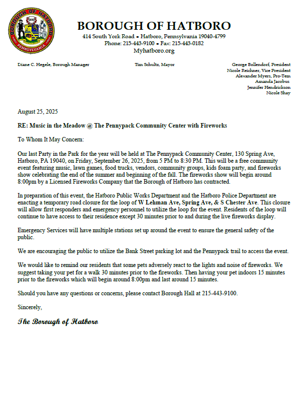 This notification was posted by Hatboro. Hatboro is solely responsible for this notification and unless specifically indicated, no other community or individual utilizing Savvy Citizen is sponsoring, responsible for, or endorsing this notification.