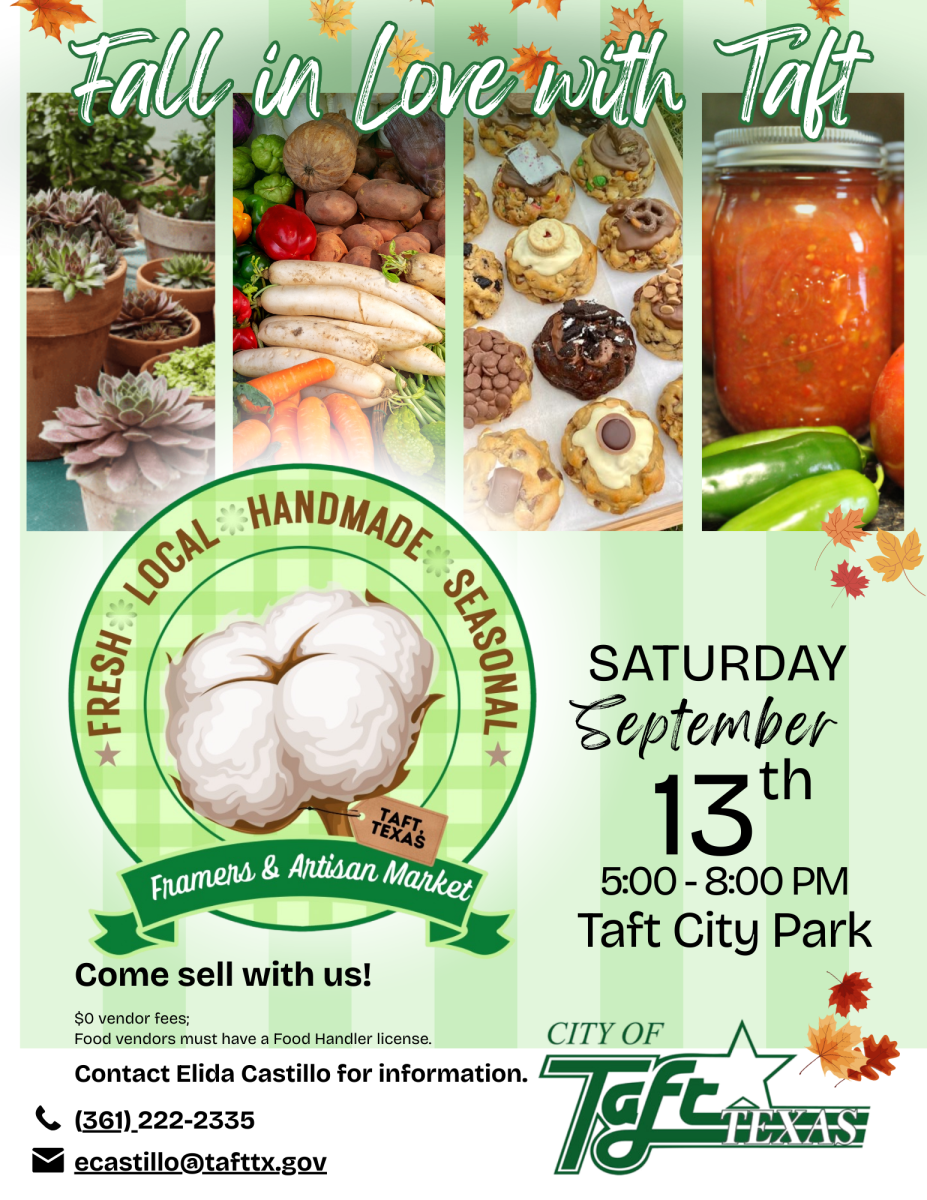 Come join in the fun at the Taft City Park for the Farmers and Artisan Market on Saturday, September 13th, from 5:00 – 8:00 PM!