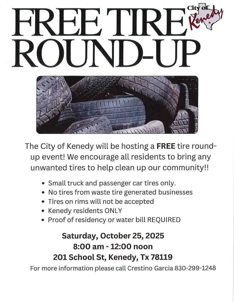 The City of Kenedy is hosting a Free Tire Round-Up on Saturday, October 25, 2025. Please see flyer for detailed information.