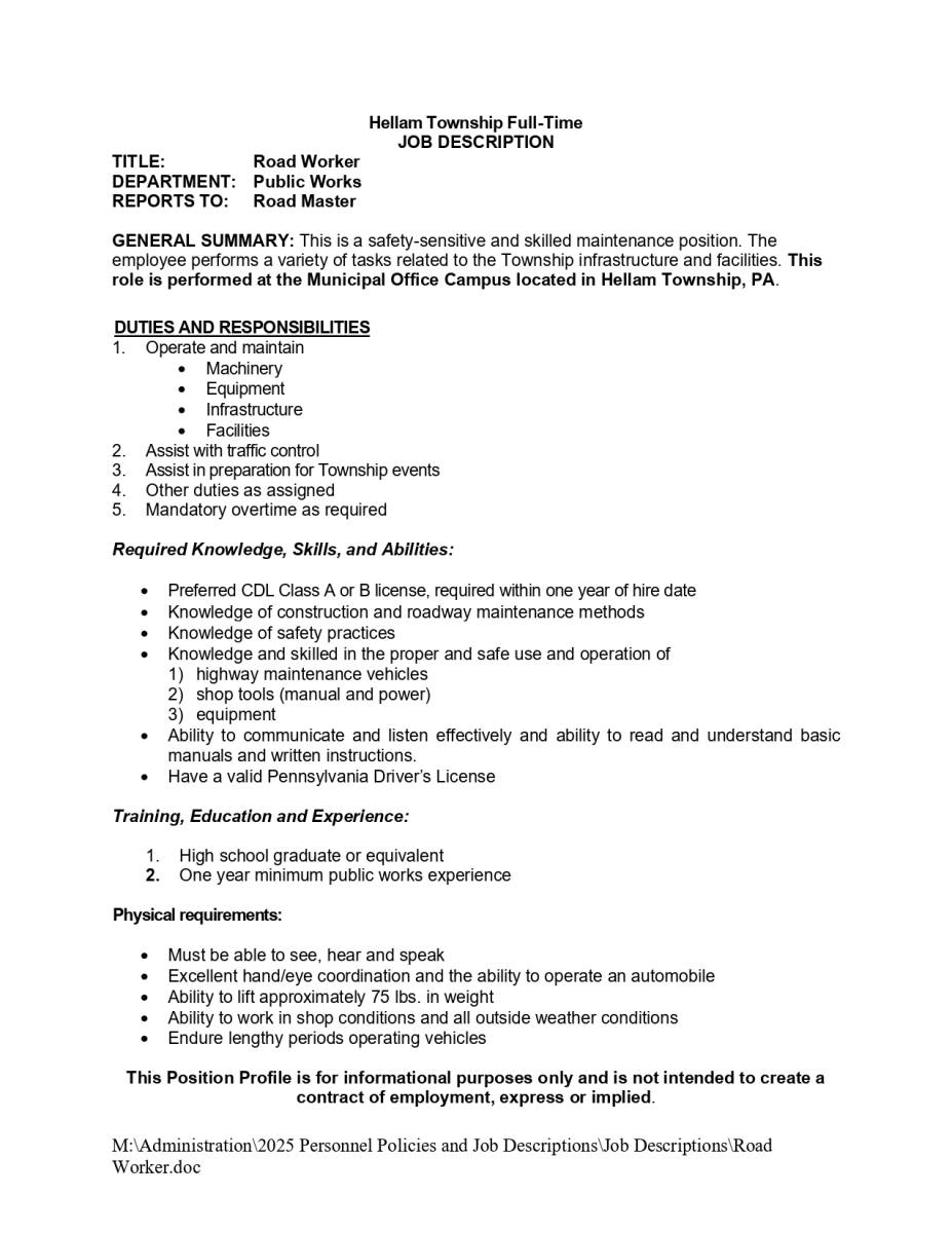 Hellam Township is looking to hire a part time/seasonal employee for our Public Works Department. If interested, please come in for an application, or visit our website www.hellamtownship.gov and search "Employment." There you will find the open positions we have available and our employment application. Please fill out the application and either drop it off in-person at 35 Walnut Springs Road York, PA 17406, or email it to Corina Mann, Township Manager, at info@hellamtownship.gov. If you have any questions, please call 717-434-1300. We can't wait to hear from you!
