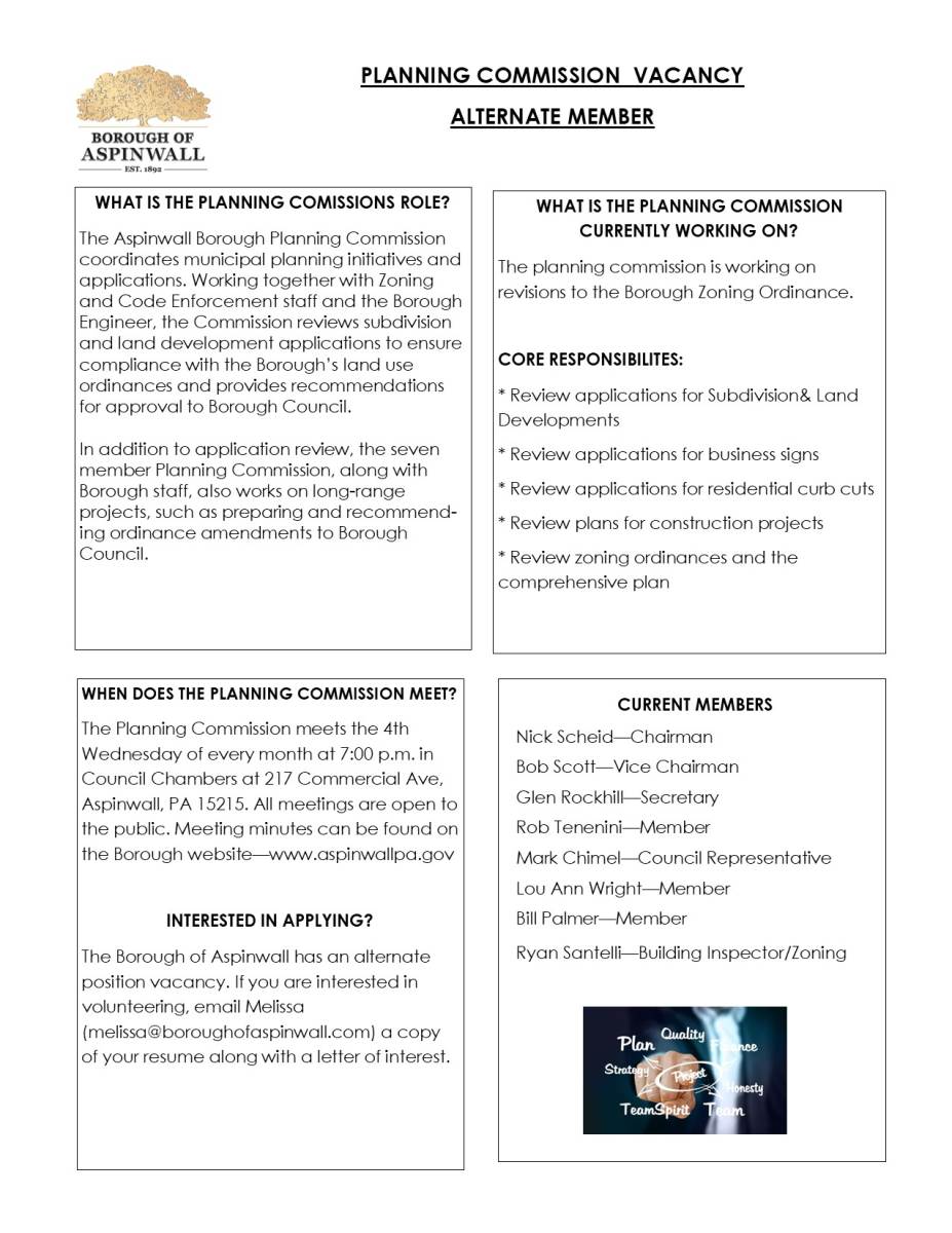 The Borough of Aspinwall has an alternate position vacancy. If you are interested in volunteering, email Melissa (melissa@boroughofaspinwall.com) a copy of your resume along with a letter of interest. Check out the ad on the Borough website for more information www.aspinwallpa.gov