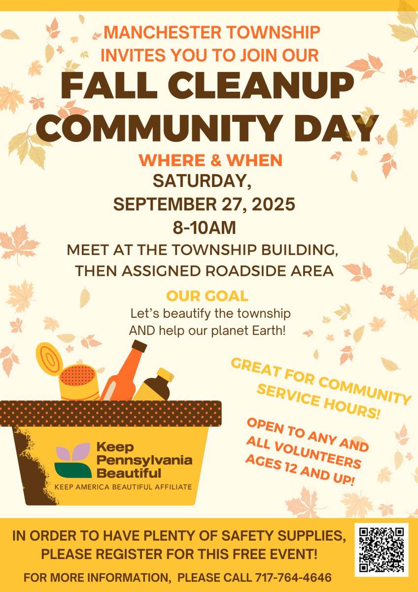 Join us for our Fall Clean Up Community Day on Saturday, September 27th from 8:00 am - 10:00 am. We will meet at the township building 3200 Farmtrail Road, York, PA 17406 at 8:00 am and then drive to the assigned roadside area.