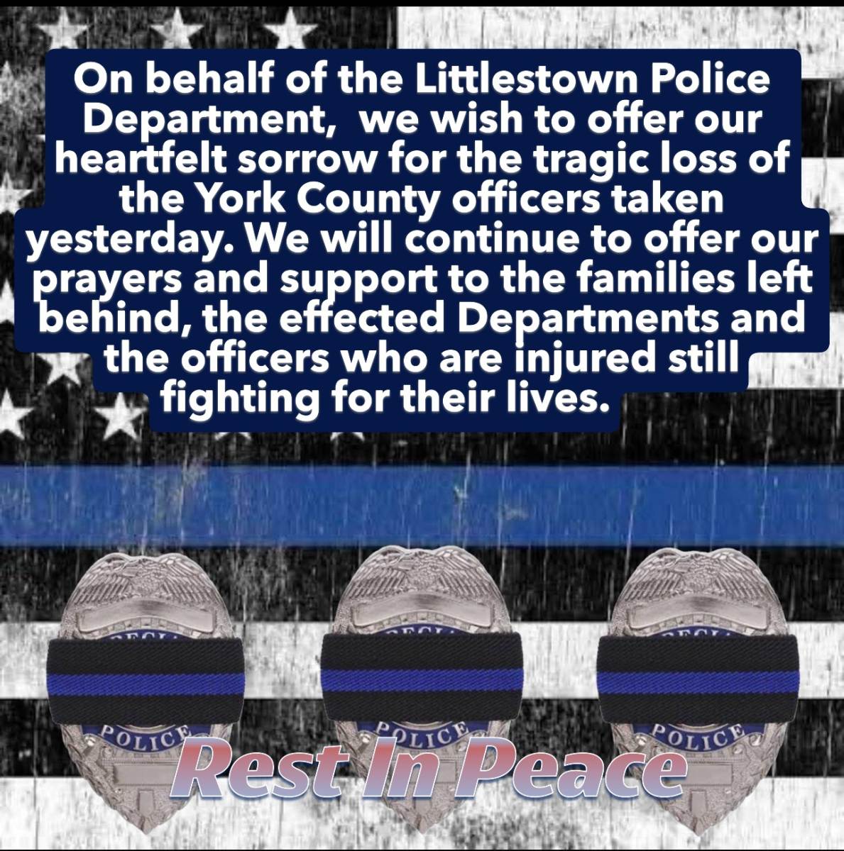 On behalf of the Littlestown Police Department, we wish to offer our heartfelt sorrow for the tragic loss of the York County officers taken yesterday. We will continue to offer our prayers and support to the families left behind, the effected Departments and the officers who are injured still fighting for their lives.