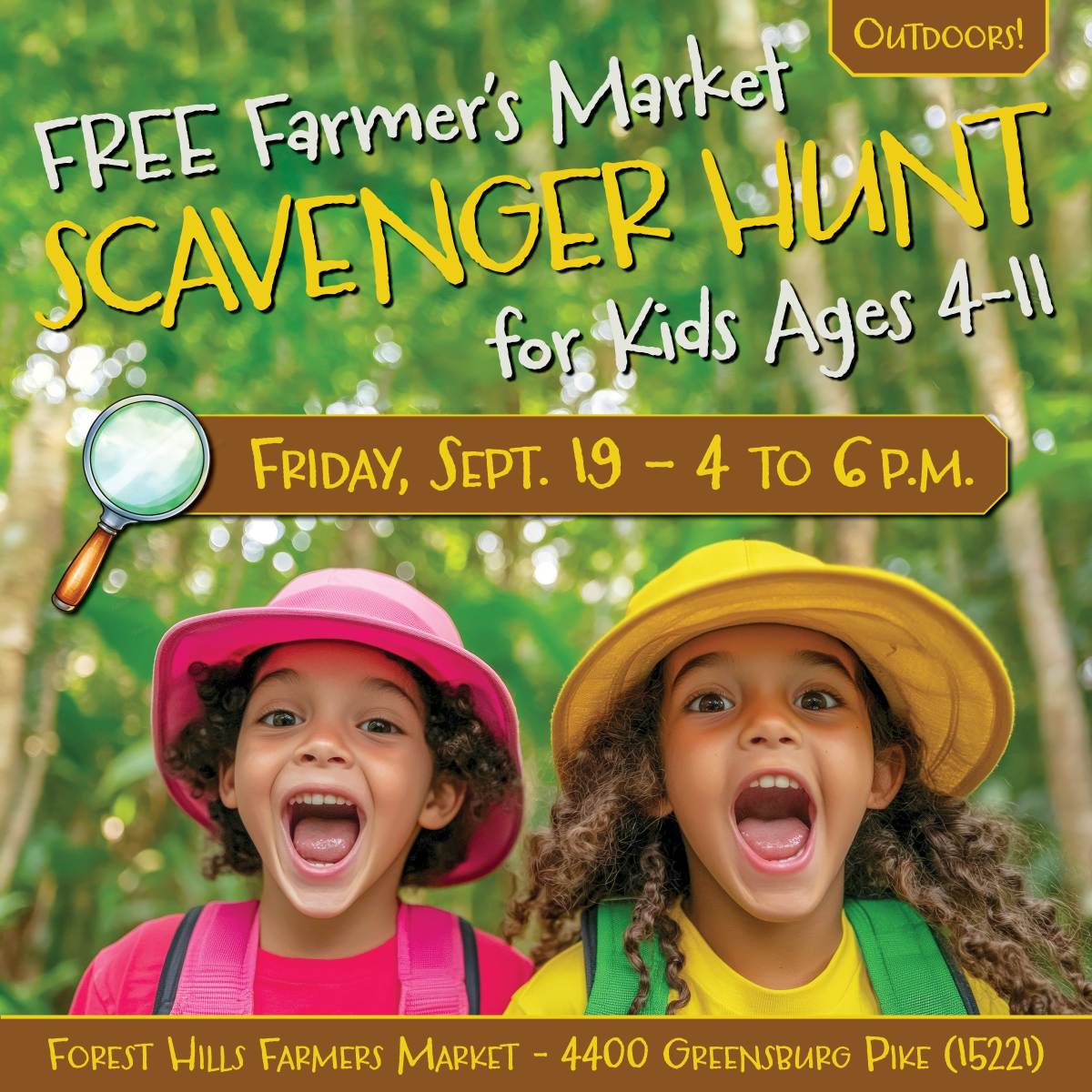 The Forest Hills Farmer's Market will be hosting a kid's scavenger hunt for children ages 4-11 at the Market from 4-6 pm on Friday, September 19th.