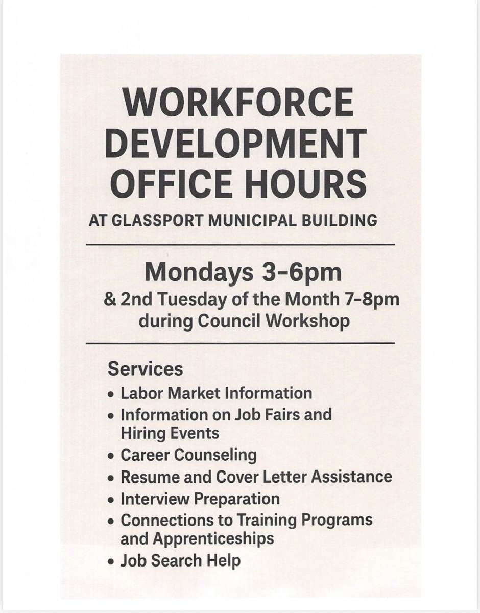 Workforce Development Office are Mondays 3-6pm & 2nd Tuesday of the Month 7-8pm during Council