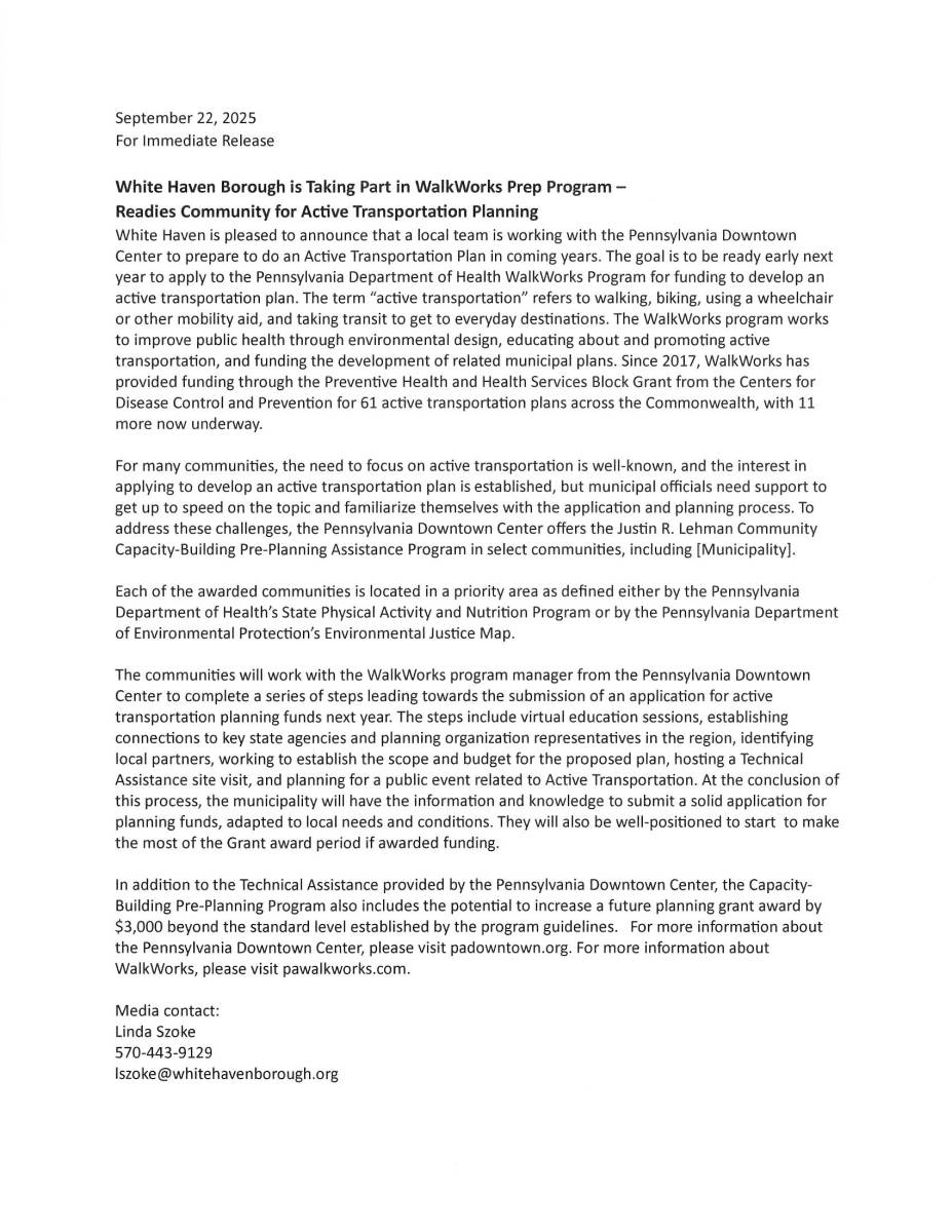 White Haven Borough is taking part in WalkWorks Prep Program - Readies community for Active Transportation Planning