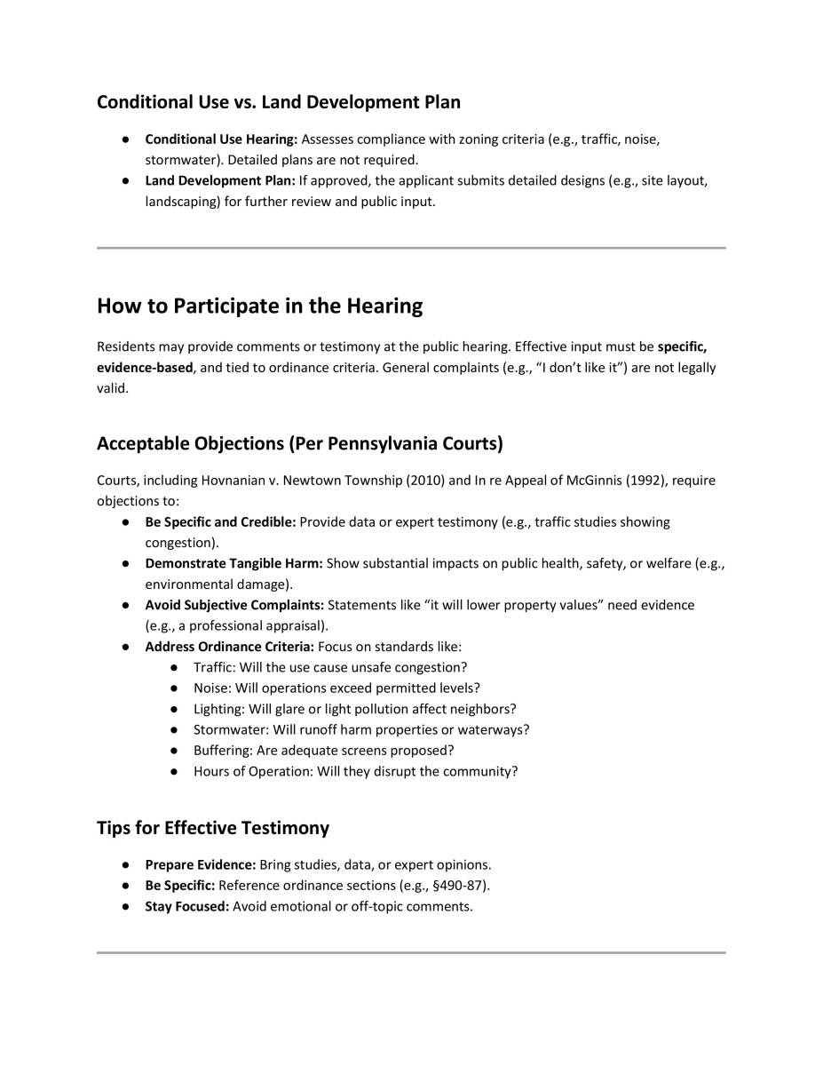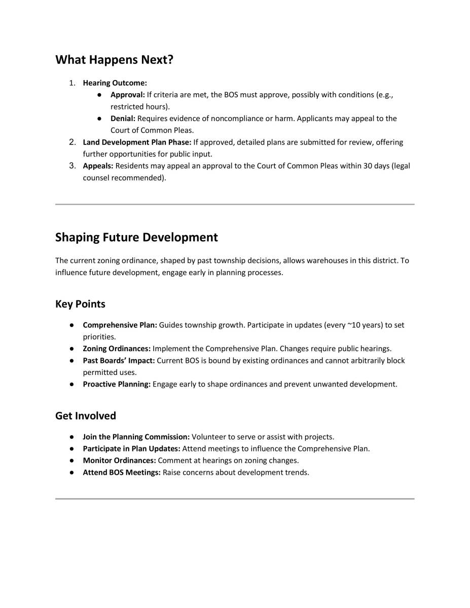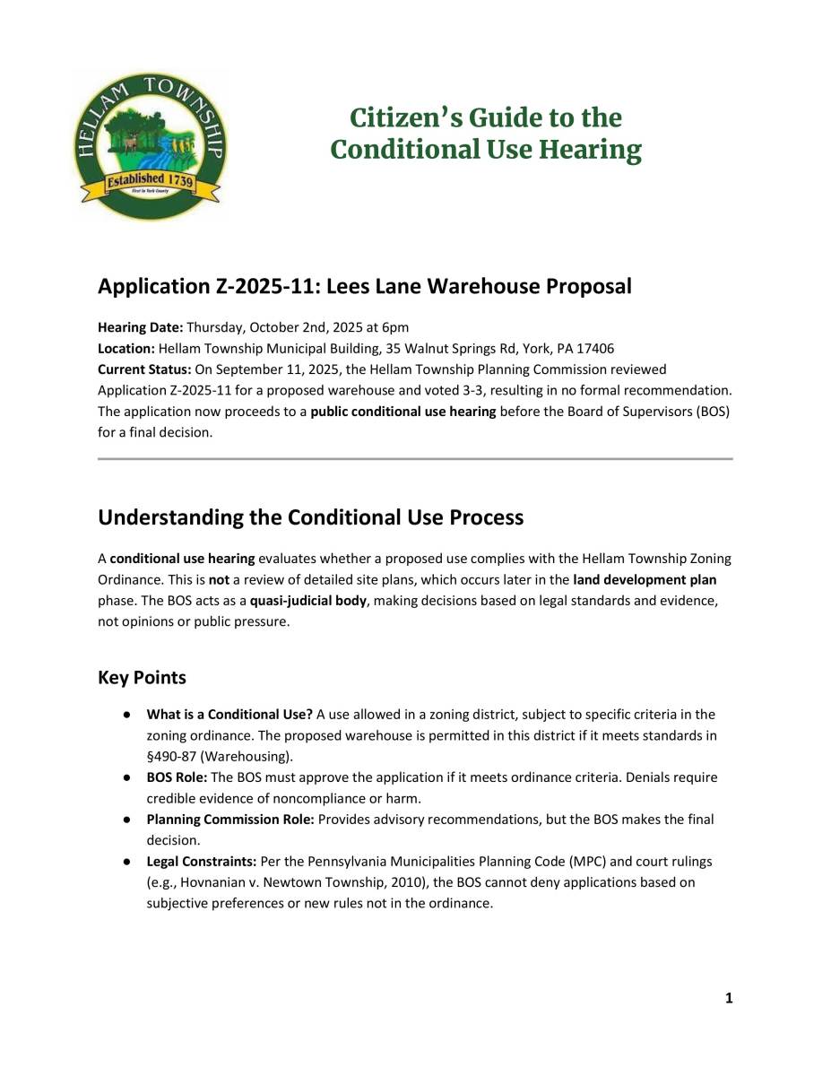 Please take a moment to review our "Citizen’s Guide to the Conditional Use Hearing", to acquaint yourself with the process before our next Board of Supervisors meeting, on October 2, 2025 at 6PM, which will hear Application Z-2025-11: Lees Lane Warehouse Proposal.