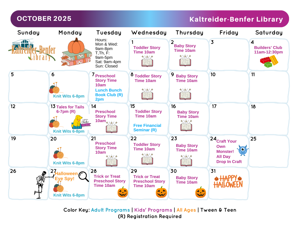 Attached you will find the October calendar for the Kaltreider Library. The library is open to the public and would love for you to visit and see what they have to offer. Stop in and explore !