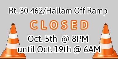 Pennsylvania Department of Transportation (PennDOT) UPDATE: The Route 30 West 462/Hallam exit ramp closure will be extended to October 19th @ 6:00 AM.