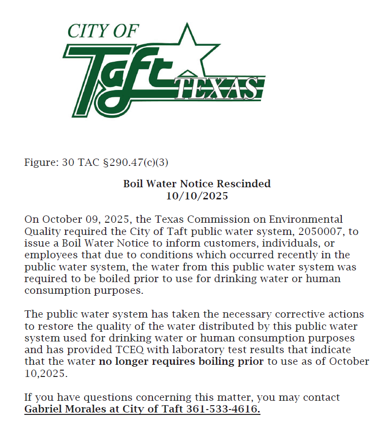 Gabriel Morales at City of Taft 361-533-4616.