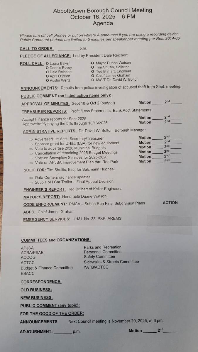 This notification was posted by Borough of Abbottstown. Borough of Abbottstown is solely responsible for this notification and unless specifically indicated, no other community or individual utilizing Savvy Citizen is sponsoring, responsible for, or endorsing this notification.