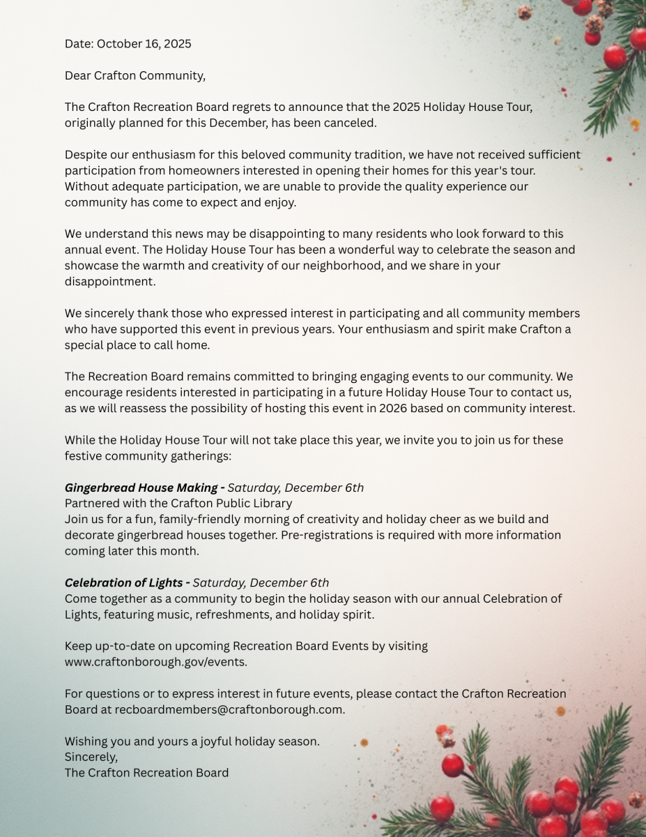 The Crafton Recreation Board regrets to announce that the 2025 Holiday House Tour, originally planned for this December, has been canceled.