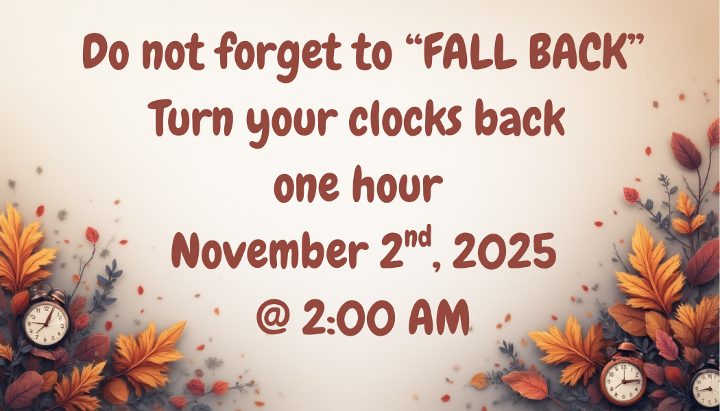 Remember to "Fall Back" and set your clocks back one hour before going to bed Saturday night. The time change will occur Sunday, November 2 at 2AM.