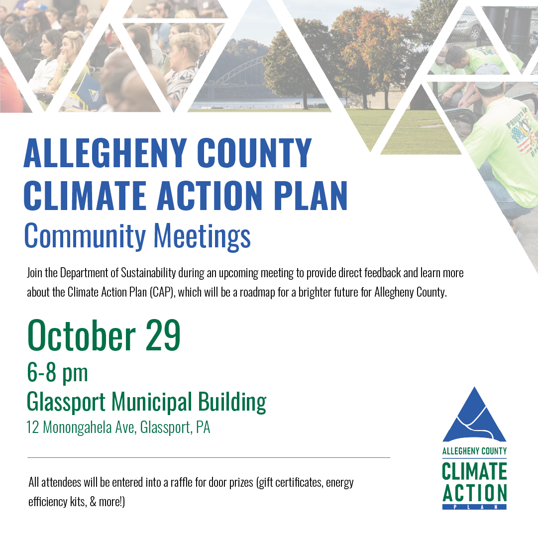 Climate Action Plan (CAP) public meeting will be held on October 29th at the Glassport Municipal Building. This meeting is to provide direct feedback and learn about the CAP.