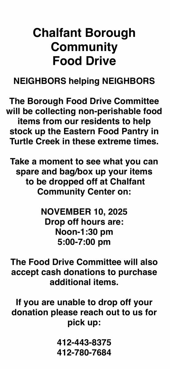 The Chalfant Borough Food Drive Committee will be collecting non-perishable food items at the Chalfant Community Center on November 10th to help stock the Eastern Food Pantry in Turtle Creek. The drop-off hours on 11/10 are: