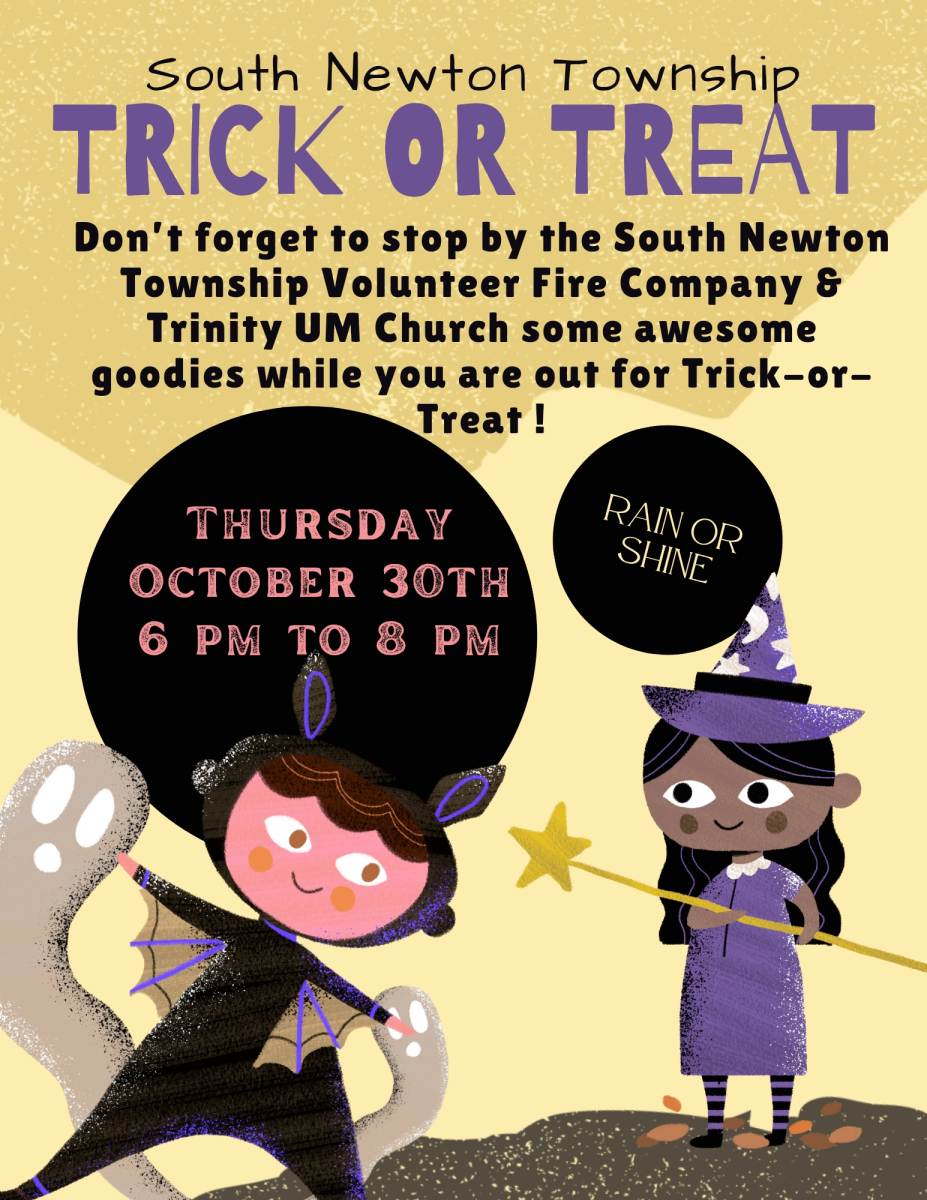 Just a quick reminder that Trick-or-Treat is tomorrow night in South Newton Township from 6-8 pm rain or shine. There will be signs and police presence to keep everyone safe. Please use the sidewalks and chaperone your children. Don't forget to stop by the Company 49 Firehouse for some goodies and Trinity United Methodist Church Trunk-or-Treat. Flyer is attached.