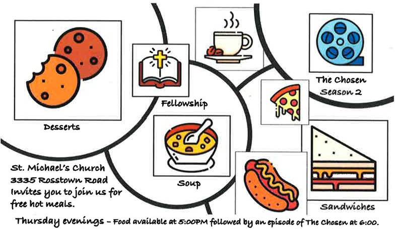 St. Michael's Church, 3335 Rosstown Rd, Wellsville will offer free hot meals on Thursday evenings. Food available at 5:00PM, followed by an episode of The Chosen at 6:00PM. Spread the word to those in need.