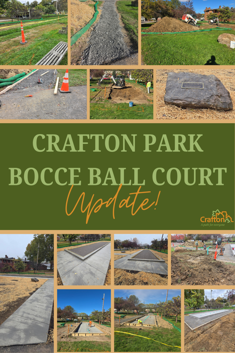 Our brand-new Bocce Court is almost complete and ready for play! Located in Crafton Park, this regulation size court replaces the old playing surface with a newly built one, added concrete sidewalks and drainage improvements. Funded completely by donations, the beautiful addition is perfect for friendly matches, community gatherings, or just trying something new.