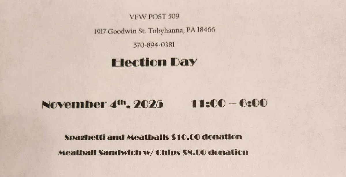 Head over to VFW Post 509 (1917 Goodwin Street, Tobyhanna, PA) for the Annual Election Day Meal Specials! On Tuesday, November 4, 2025, from 11am to 6pm, enjoy a delicious Spaghetti and Meatball Dinner for a $10 donation, or grab a Meatball Sandwich with Chips for just $8. Support your local veterans and enjoy great food—see you there!